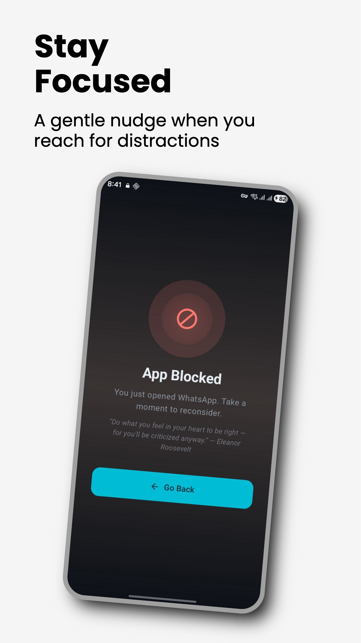 A full-screen nudge when you reach for blocked apps. Stay on track.