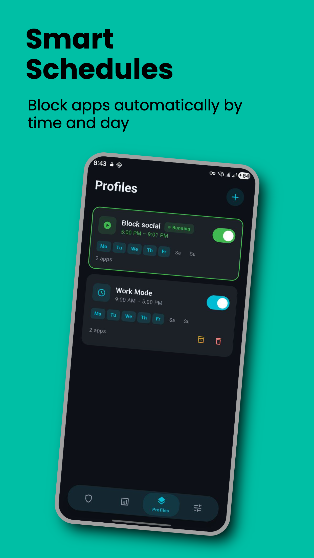 Create profiles for Work, Study, or Sleep with automatic time-based blocking.